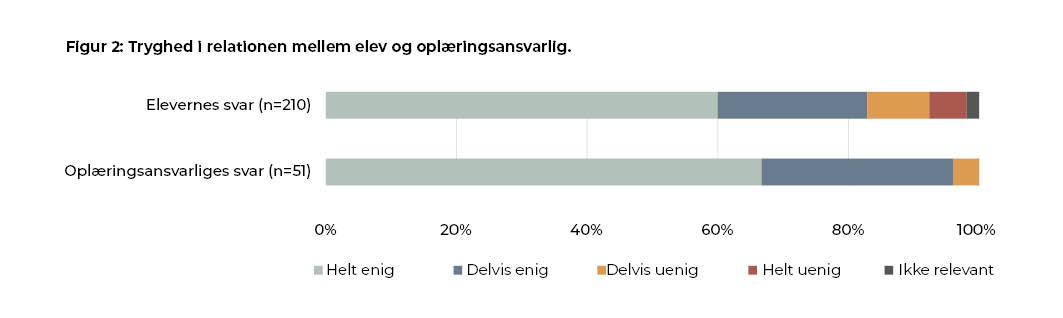 Vi har haft samtaler med elever, som virker helt uforstående overfor, at klientkommunikation skulle være en udfordring. Fælles for disse elever er, at de generelt føler sig meget trygge på deres arbejdsplads og ved deres kolleger. Hvis de støder på spørgsmål, som de ikke kender svaret på, ”jamen, så spørger jeg jo bare en af de andre”. Det illustrerer vigtigheden af, at eleverne oplever et trygt læringsmiljø, hvor det at ‘spille elevkortet’ ikke er en falliterklæring, men en helt naturlig del af at være under oplæring. Som oplæringsansvarlig må man være åben for, at der kan være forskel på, hvordan henholdsvis eleven og en selv opfatter graden af tryghed i relationen (Figur 2). Det er kun godt halvdelen (60 procent) af eleverne, der svarer, at de er helt trygge ved at tale med deres oplæringsansvarlige om bekymringer på arbejdet. Ofte handler det om, at eleven ‘klikker’ bedre med andre kolleger end den oplæringsansvarlige. Dog er det værd at nævne, at en del elever også fremhæver det grænseoverskridende i at gå til den oplæringsansvarlige med bekymringer, hvis denne person samtidig også er elevens/klinikkens chef – eller er i et personligt forhold til klinikkens chef. Dette underminerer et trygt læringsmiljø.I tilfælde af manglende kemi eller andre forhold på klinikken, kan eleven med fordel tilknyttes en mentor i form af en anden kollega, som eleven har tillid til.
