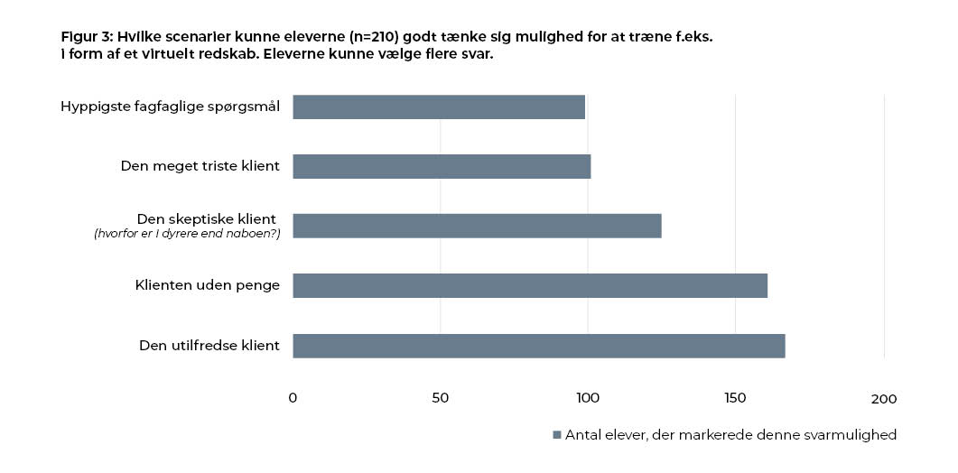 I spørgeskemaet blev eleverne bedt om at angive de scenarier, som de gerne vil have konkret og mere oplæring i – for eksempel via træning med kunstig intelligens. Her ønskede næsten 80 procent af eleverne mulighed for at træne konflikthåndtering – og 48 procent ønskede mulighed for træning af, hvordan de meget triste klienter bedst håndteres (se i øvrigt Figur 3).