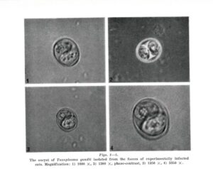 Herefter blev kattenes afføring nøje undersøgt, og glæden var stor, da det viste sig, at der blev udskilt oocyster i fæces. Denne her artikels førsteforfatter havde den ære, som den første at få øje på oocysterne i mikroskopet.